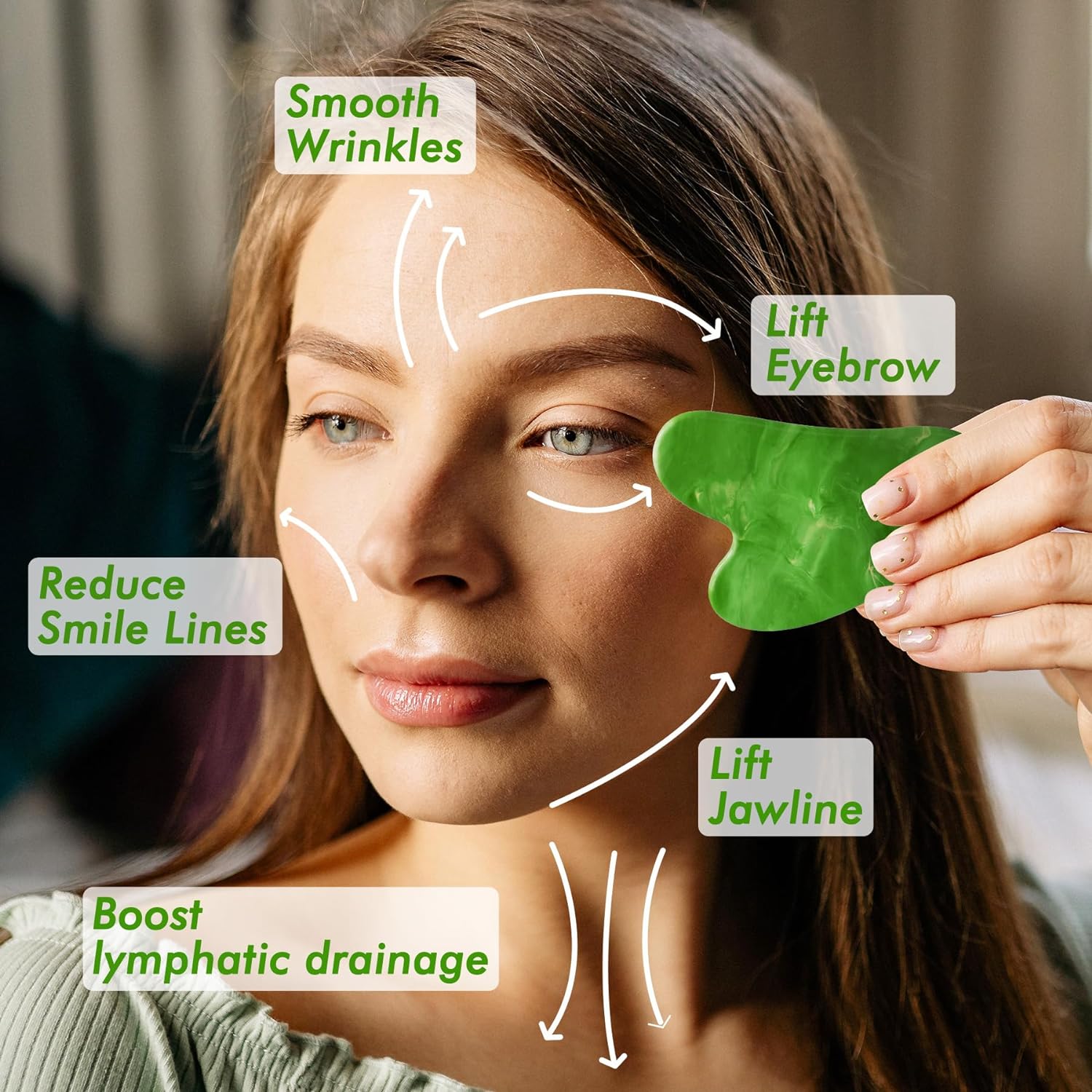 Augments lymphatic drainage, counteracting the consequences of inadequate sleep, subpar diet, or emotional stress. Applying upward pressure, it tautens the skin and diminishes wrinkles, contributing to a well-defined jawline.