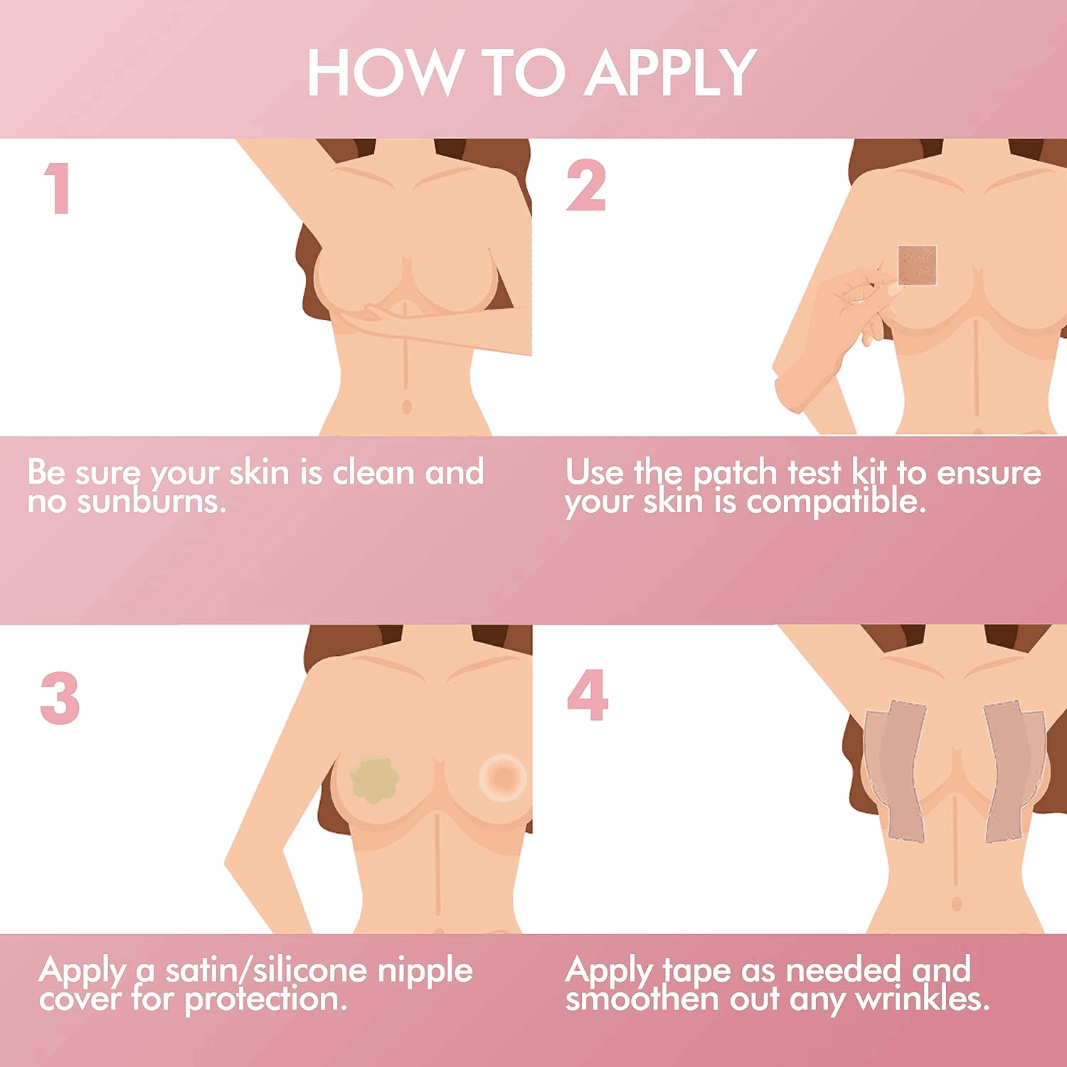- Application and removal of the breast tape are effortless; clear guidance and tips are included on the packaging. This versatile solution is ideal for donning backless, strapless, low-cut, or plunging dresses, tops, swimsuits, and more.